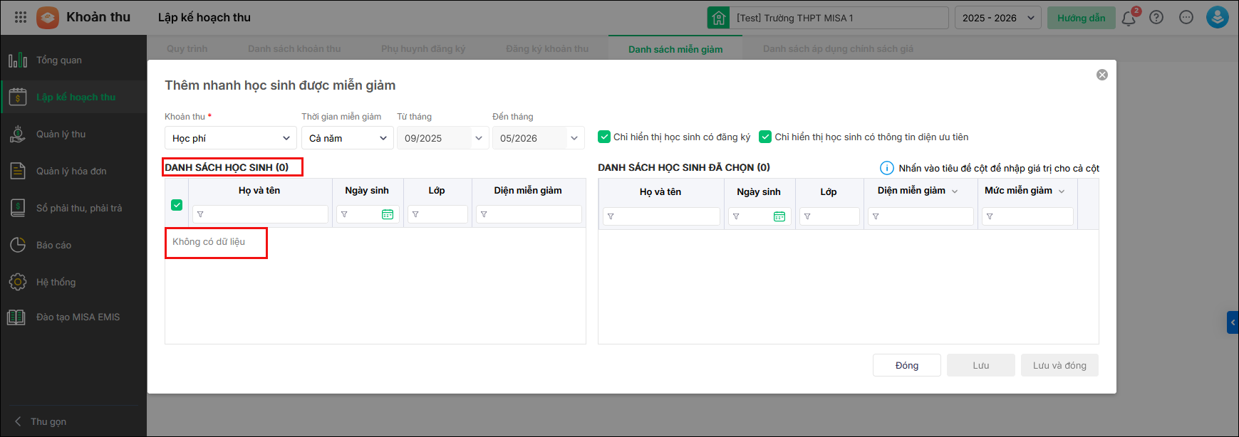 Vào Thêm nhanh danh sách miễn giảm nhưng không có danh sách học sinh.