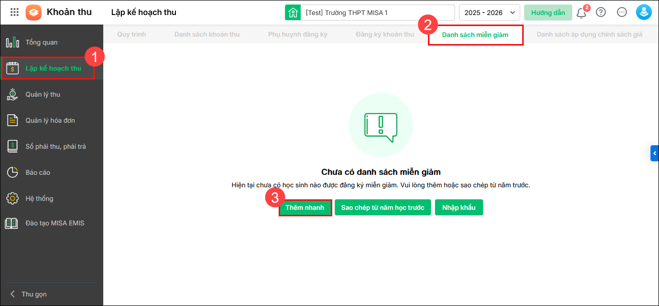Bước 3: Vào Lập kế hoạch thu\Danh sách miễn giảm, chọn Thêm nhanh để thêm nhanh danh sách miễn giảm.