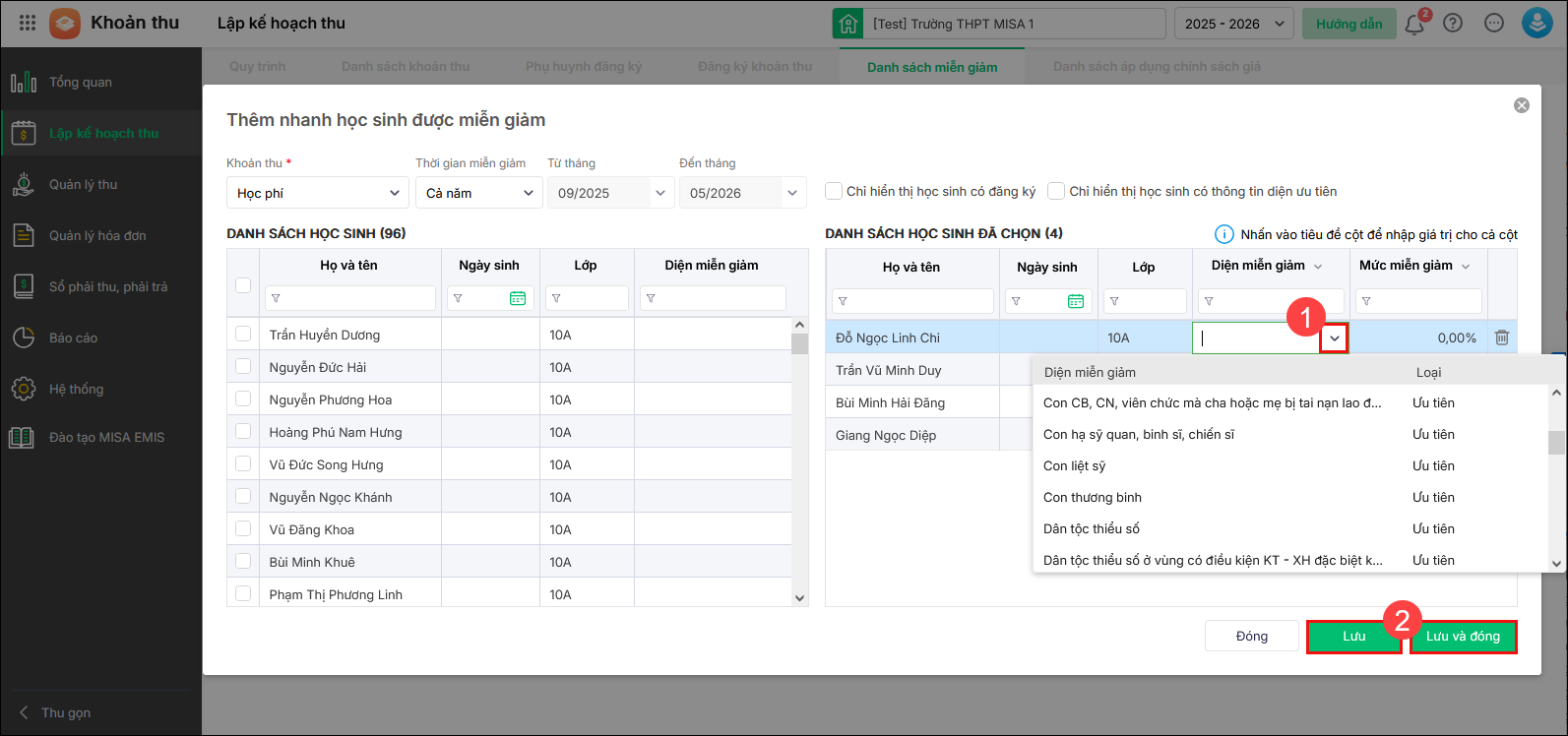 Bước 2: Nhấn biểu tượng mũi tên để chọn Diện miễn giảm cho học sinh tương ứng.