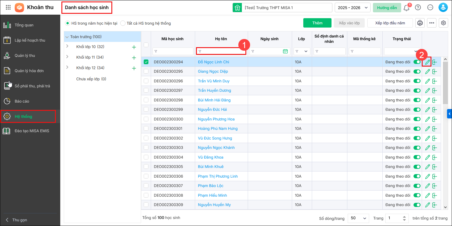 Bước 1: Vào Hệ thống\Danh sách học sinh
