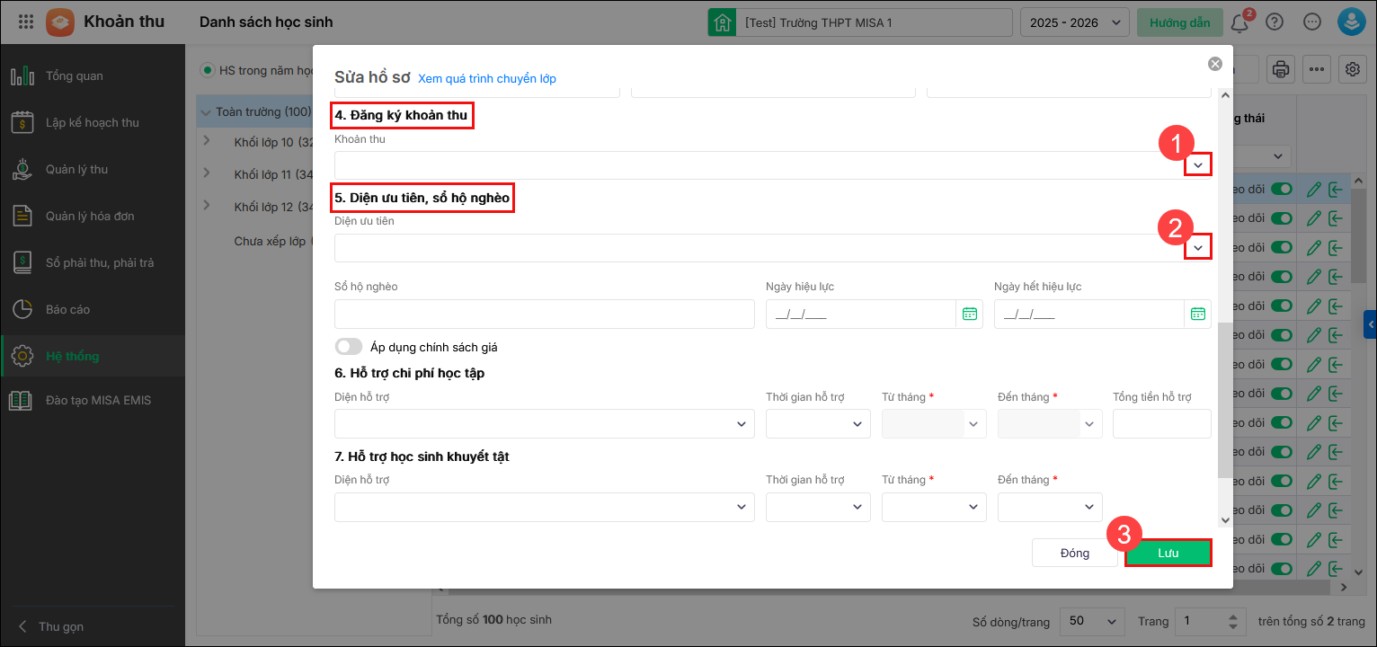 Bước 2: Tích vào biểu tượng mũi tên ở mục 4. Đăng ký khoản thu (nếu khoản thu không bắt buộc) và mục 5. Diện ưu tiên, sổ hộ nghèo. Nhấn Lưu để cập nhật.