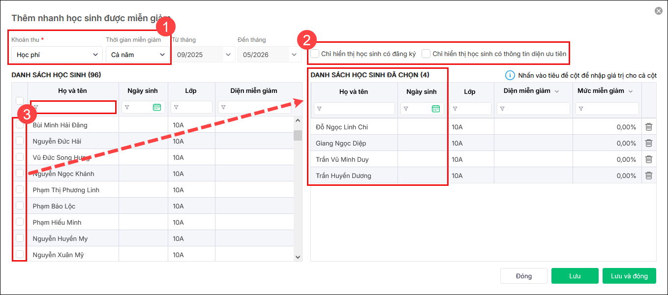Cách 1: Khi thêm nhanh danh sách miễn giảm bỏ tích các ô: Chỉ hiển thị học sinh có đăng ký và Chỉ hiển thị học sinh có thông tin diện ưu tiên