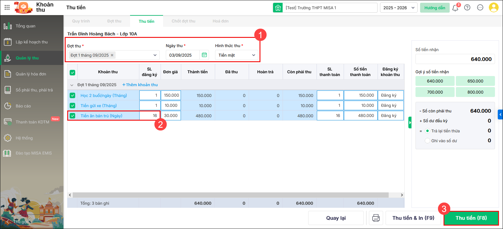 Nhấn Thu tiền để hoàn tất cập nhật và thu tiền cho học sinh.