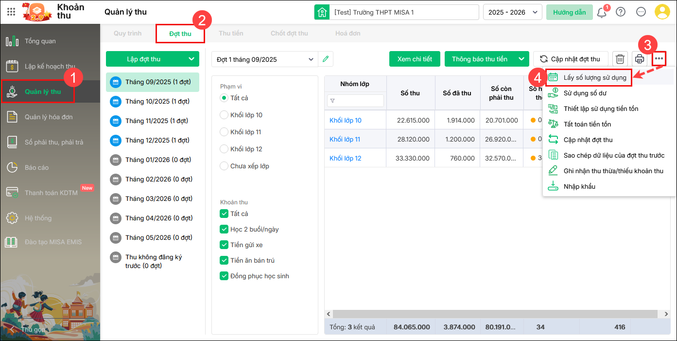 Bước 1: Vào Quản lý thu\Đợt thu, tích chọn đợt thu cần sửa. Nhấn vào biểu tượng dấu ba chấm, chọn Lấy số lượng sử dụng.