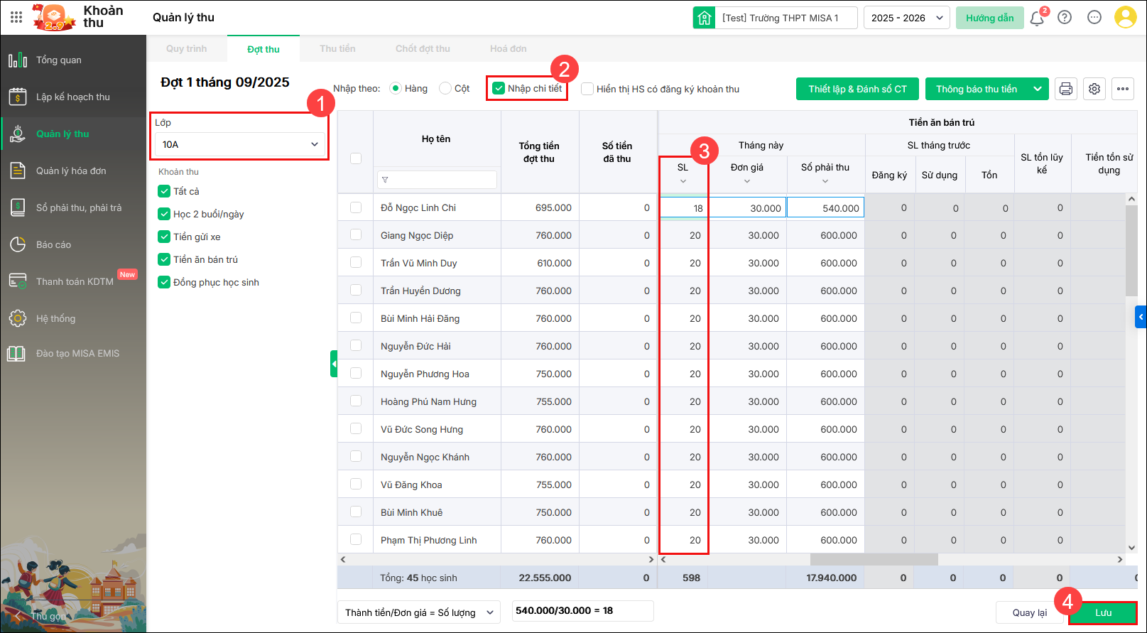 Cách 1: Sửa trực tiếp số lượng từng học sinh trên đợt thu