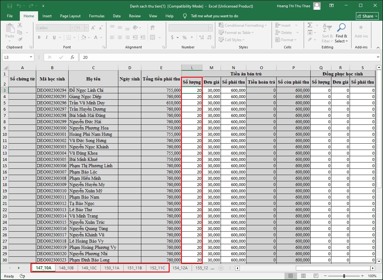 Bước 3: Thực hiện chỉnh sửa số liệu các cột: Số lượng khoản thu Tiền ăn bán trú của các học sinh cần thay đổi trên Tệp mẫu vừa tải ở Bước 2. (Chọn từng Sheet trên tệp excel và chỉnh sửa)