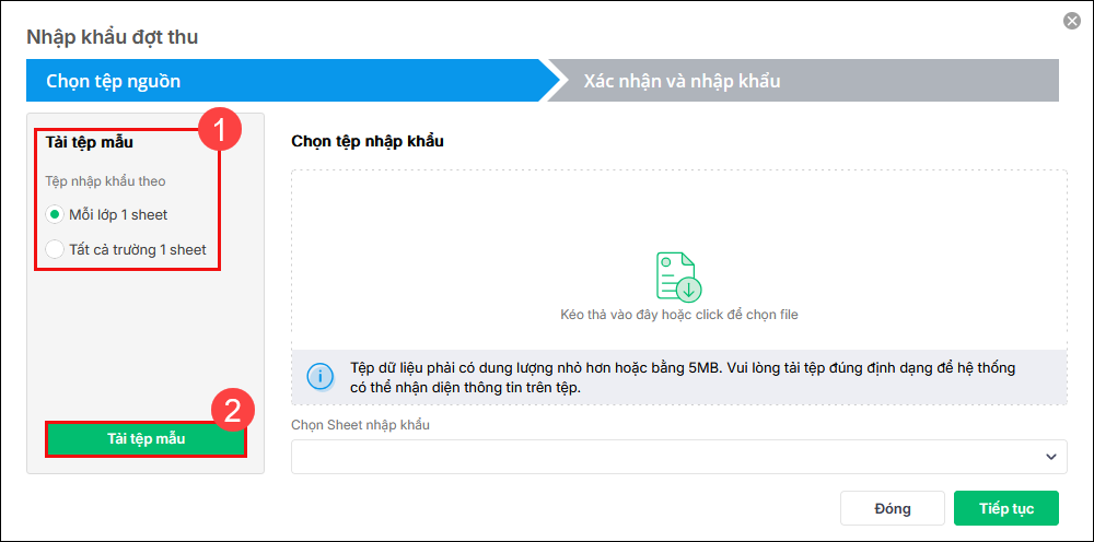 Bước 2: Chọn hình thức tệp nhập khẩu (Mỗi lớp 1 sheet/Tất cả trường 1 sheet) và nhấn Tải tệp mẫu của phần mềm.