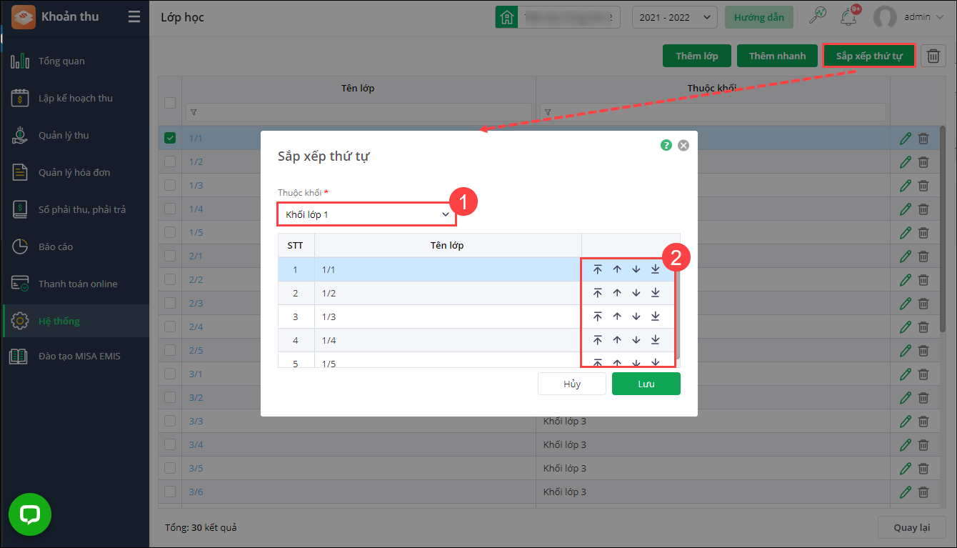 2. Nhấn vào Sắp xếp thứ tự để sắp xếp lại thứ tự các lớp trên danh sách lớp học.