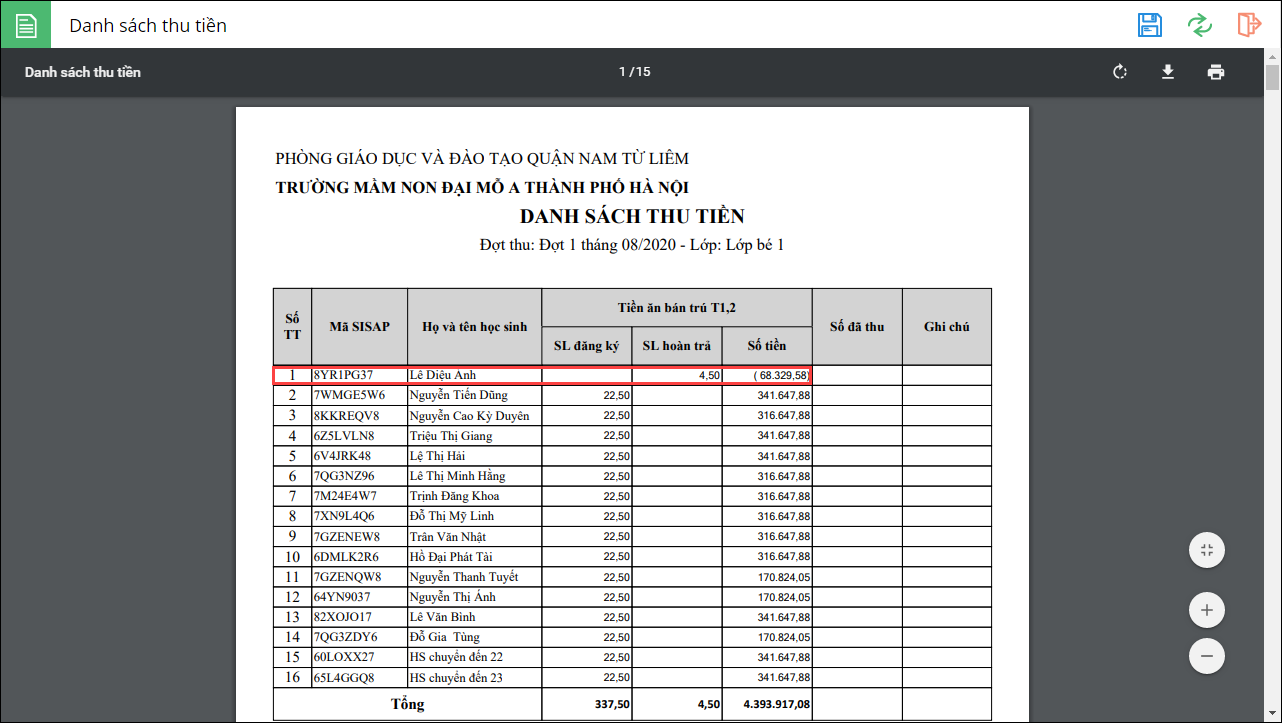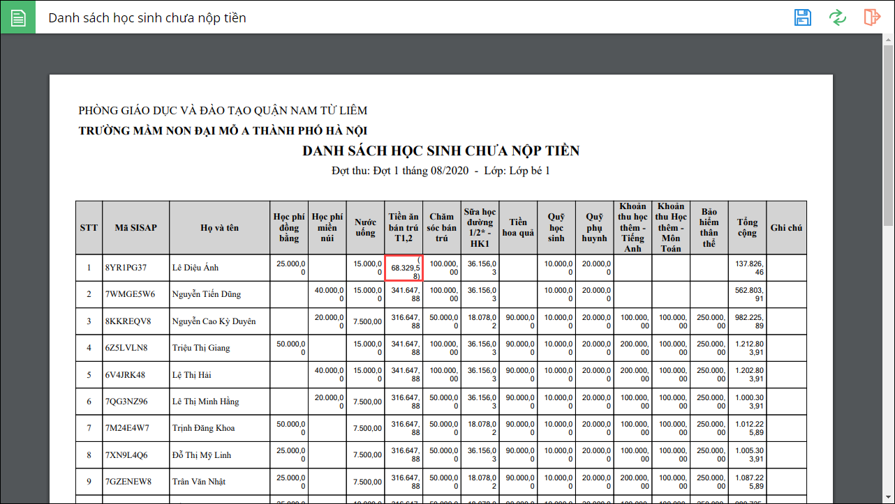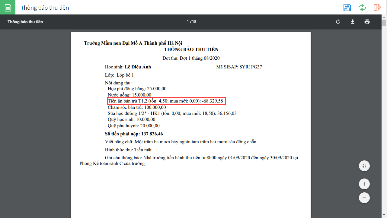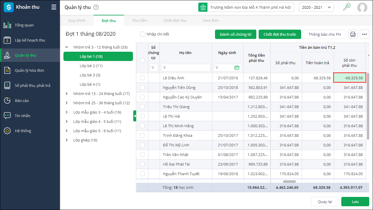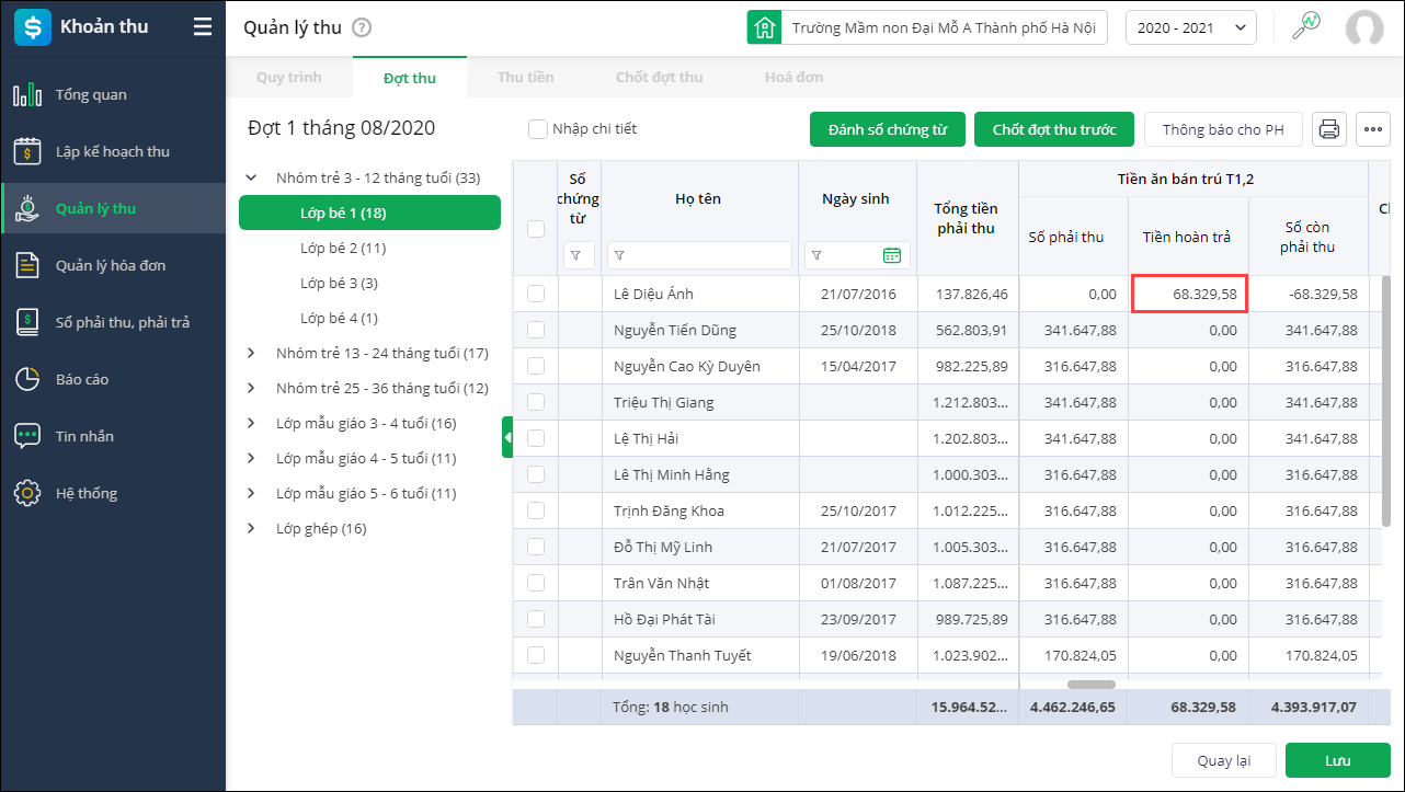 • Trước phiên bản R101.01: Tại nhà trường, tháng trước học sinh có phát sinh số tiền hoàn trả của tiền ăn bán trú,  tháng này học sinh không tiếp tục đăng ký tiền ăn bán trú. Kế toán thực hiện bù trừ tiền ăn bán trú còn dư tháng trước cho các khoản thu khác mà học sinh phải nộp trong tháng này. Tuy nhiên, trên phần mềm không lấy lên số tiền hoàn trả nếu tháng này học sinh không tiếp tục đăng ký khoản thu đó nữa hoặc có Số lượng đăng ký bằng 0.