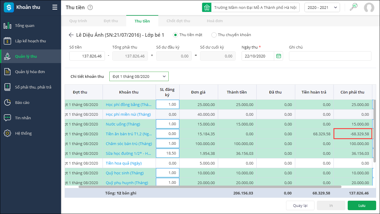2. Hiển thị số tiền phải thu của khoản thu đó là số âm