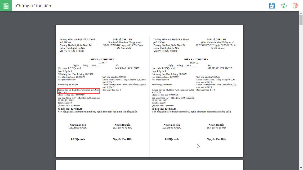1. Phần mềm hiển thị số tiền hoàn trả chưa sử dụng ở tháng trước tại ô Tiền hoàn trả