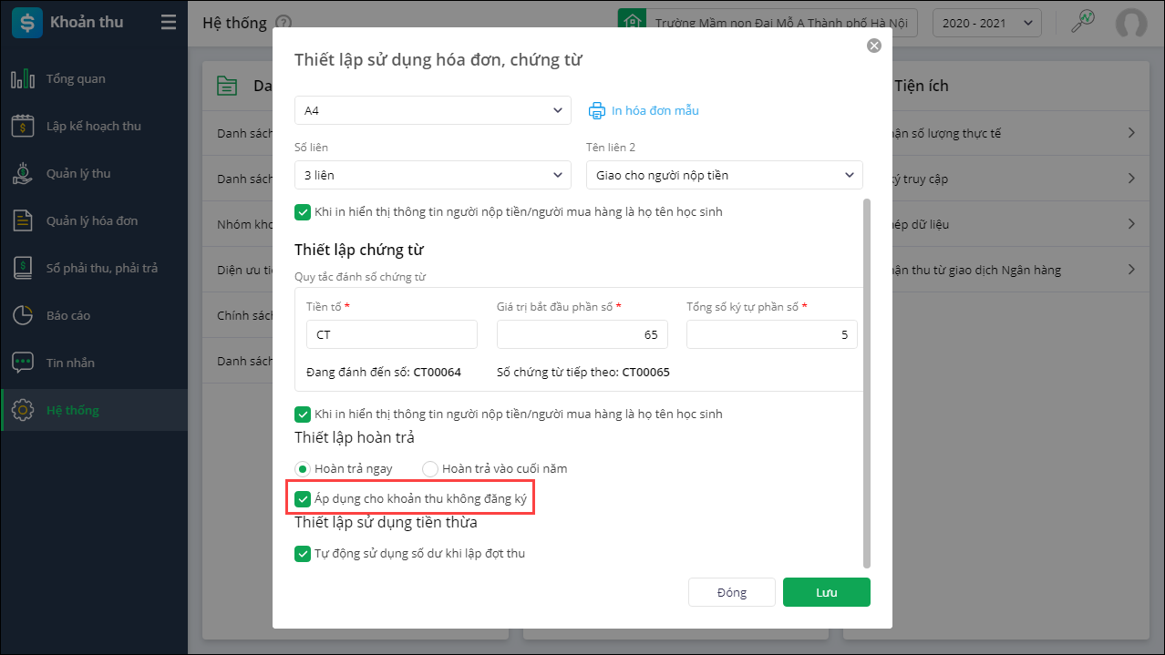 Anh/chị thực hiện thiết lập hoàn trả cho khoản thu không đăng ký.