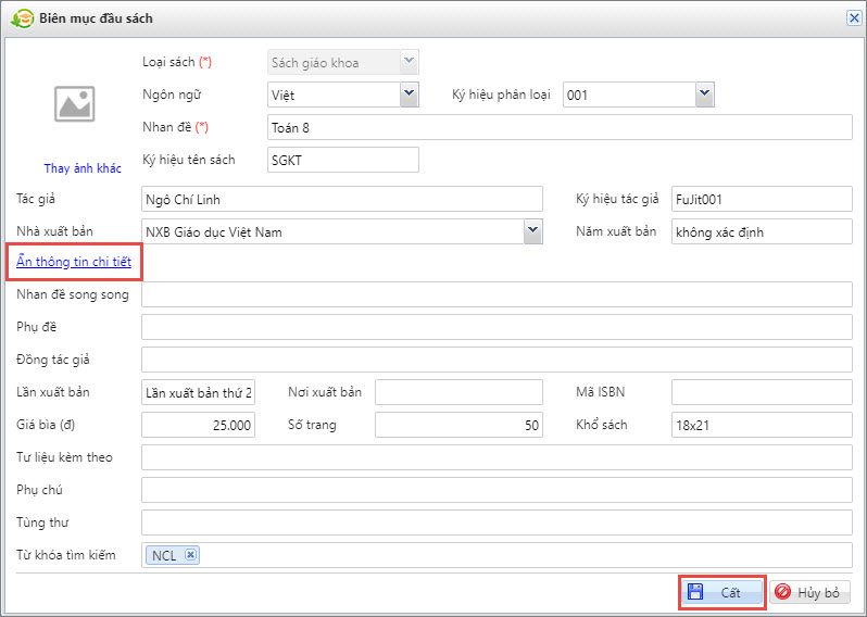 - Nếu tên Sách chưa có sẵn trong danh sách, nhấn Biên mục đầu sách mới và thực hiện khai báo thông tin trên màn hình Biên mục đầu sách. Nhấn Cất