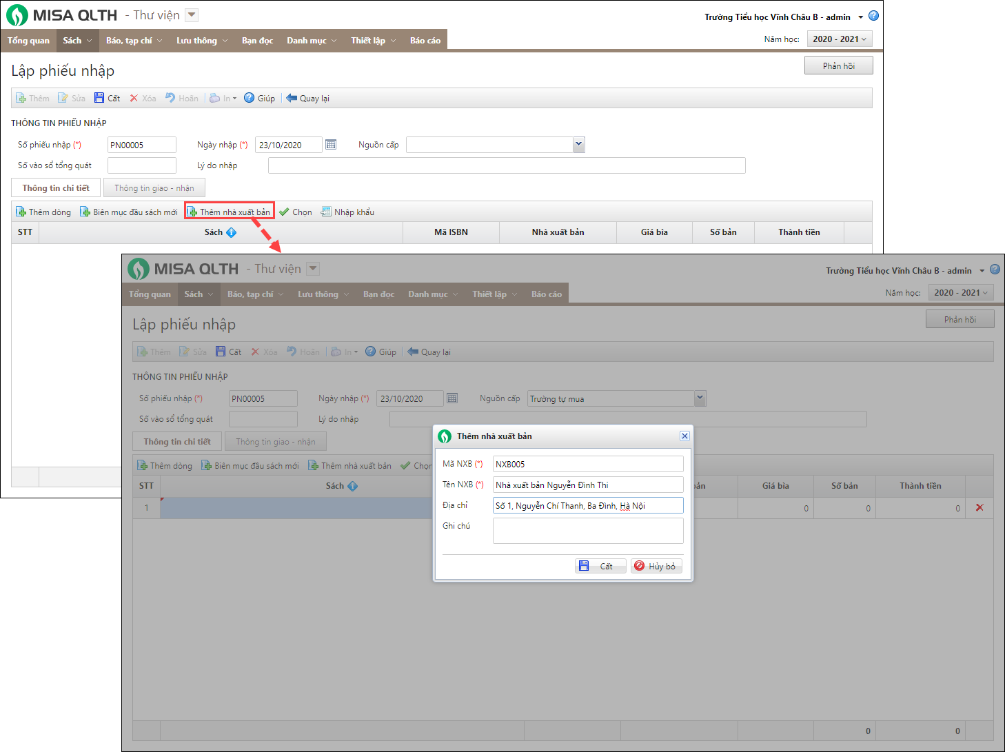 Lưu ý: Anh/chị thêm Nhà xuất bản tương tự khi Khai báo số lượng sách ban đầu.