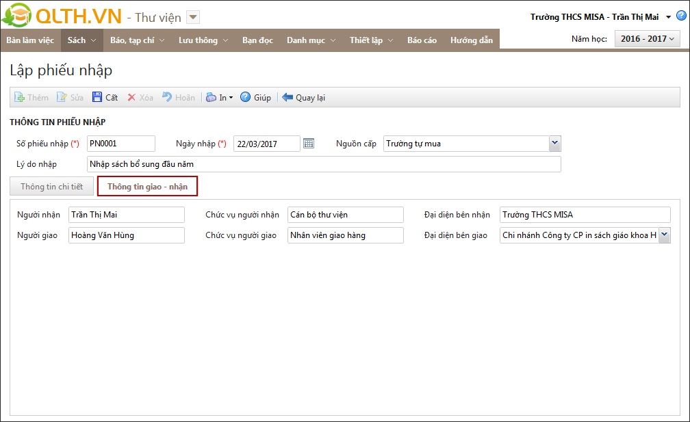 - Tại tab Thông tin giao nhận: nhập các thông tin về bên giao và bên nhận sách