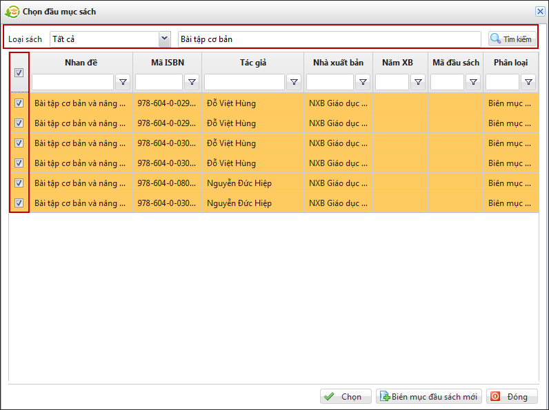- Khai báo thông tin Phiếu nhập sách chi tiết: Chương trình có mang sẵn bộ danh sách các biên mục sách đã được xuất bản của NXB Giáo dục. CBTV chỉ cần chọn trong danh sách đó thì các thông tin khác của sách sẽ được hiển thị: