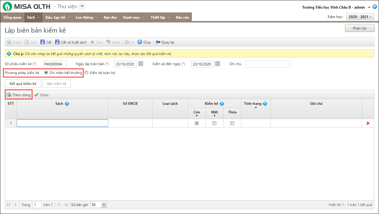 - Tích chọn tình trạng kiểm kê: Còn, mất, thừa tương ứng với từng sách.
