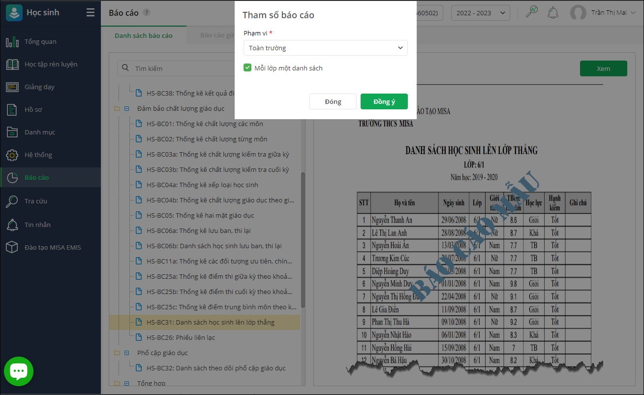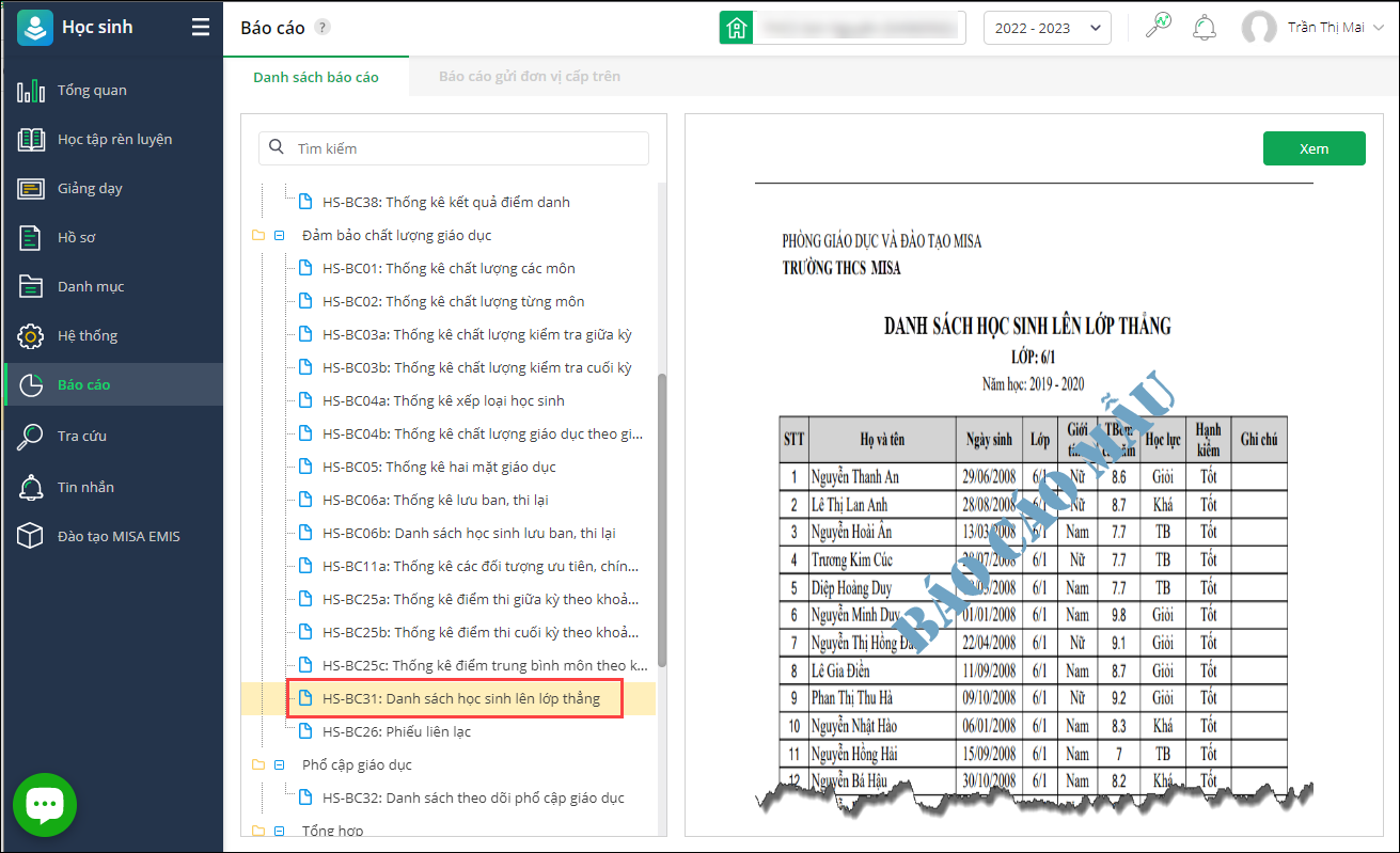 - Vào Báo cáo\Danh sách báo cáo\Đảm bảo chất lượng giáo dục. Chọn HS-BC31: Danh sách học sinh lên lớp thẳng.