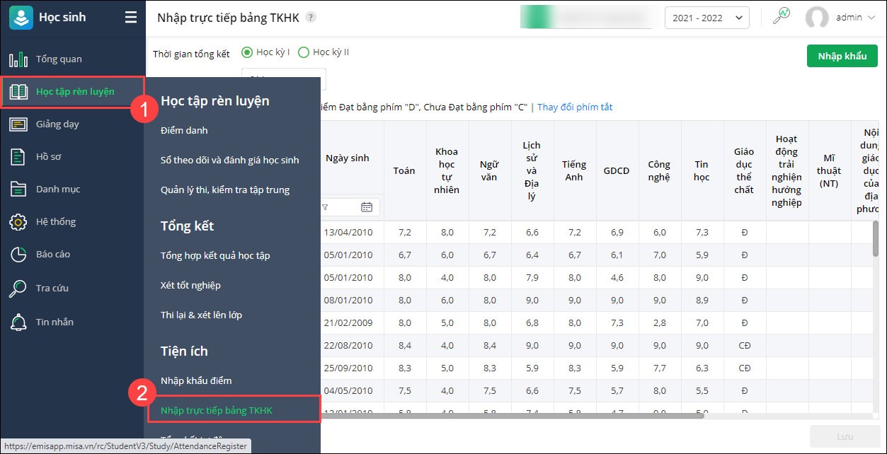 - Vào màn hình Học tập rèn luyện/Nhập trực tiếp bảng TKHK