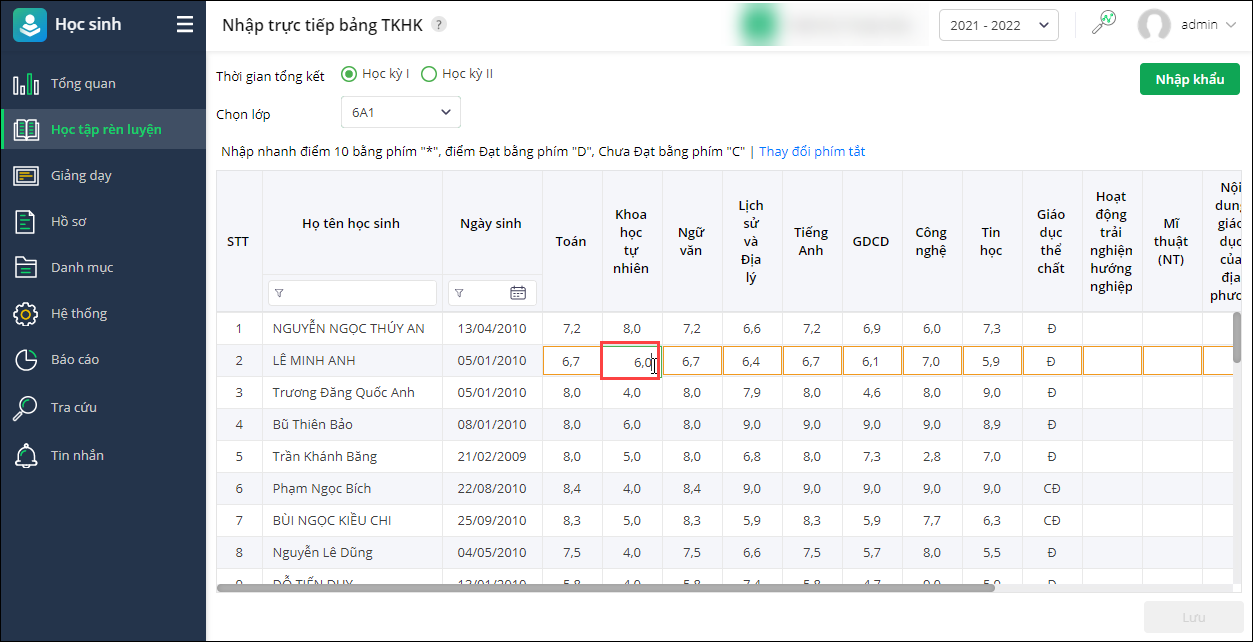 - Tại màn hình Nhập kết quả tổng kết, nhập điểm tổng kết học kì cho học sinh tương ứng