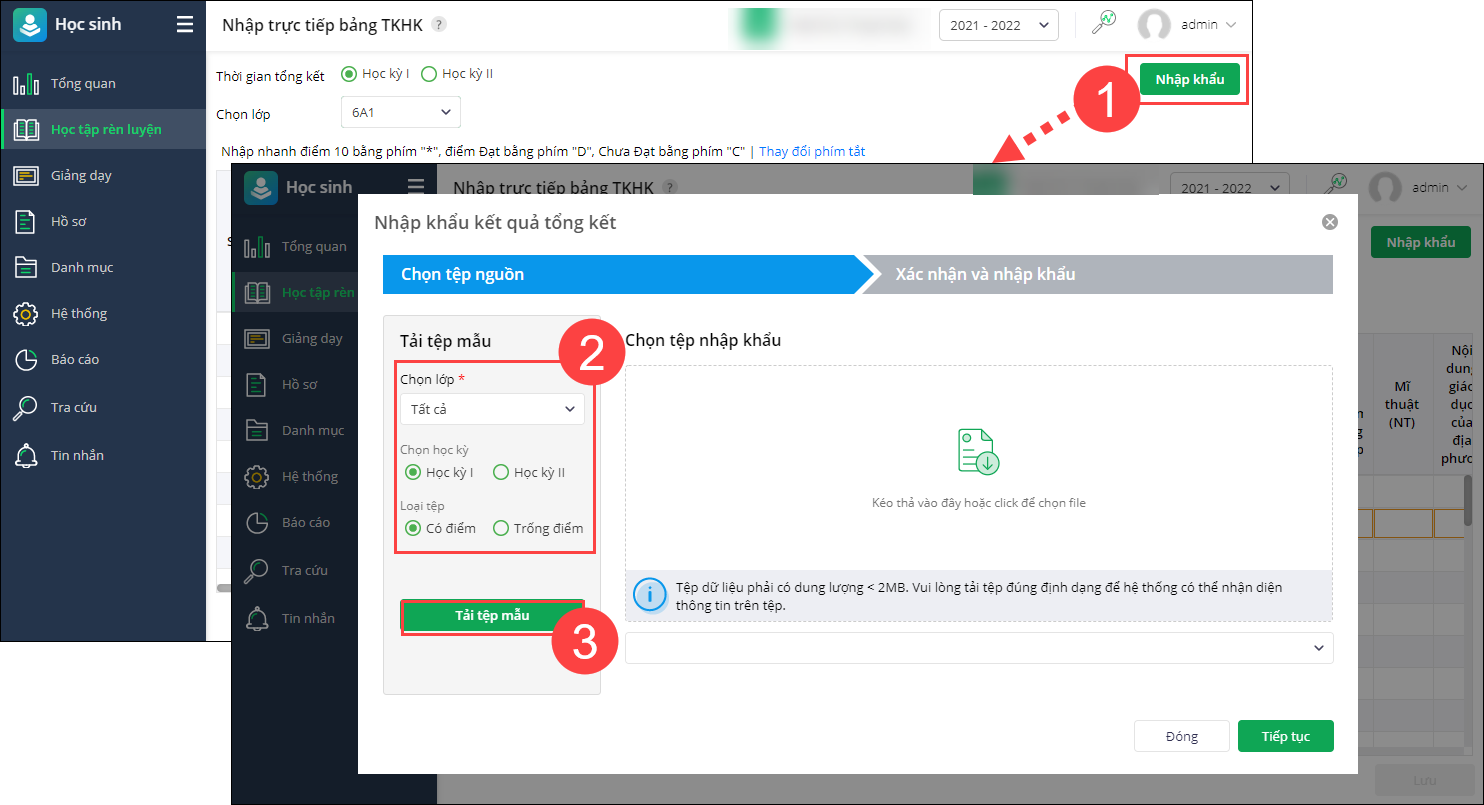 - Chọn lớp, kỳ cần nhập khẩu, nhấn Tải tệp mẫu