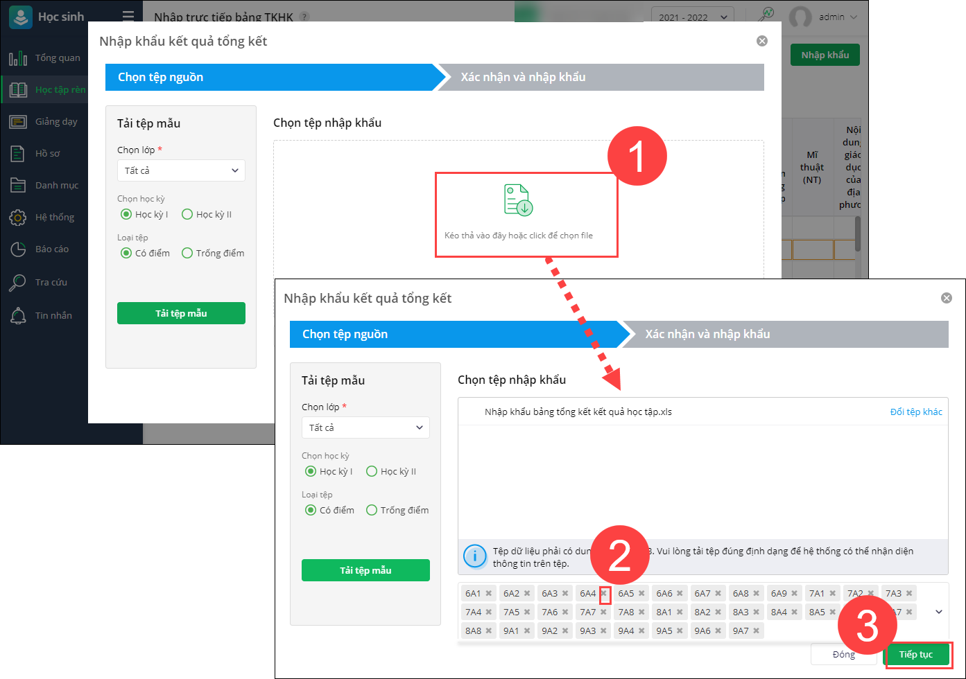 - Tải tệp mẫu lên phần mềm, chọn sheet là lớp cần nhập khẩu bảng điểm, nhấn biểu tượng dấu “x” tại sheet lớp không muốn nhập khẩu. Nhấn Tiếp tục để chuyển sang bước Xác nhận và nhập khẩu