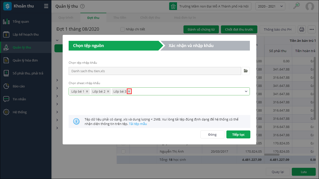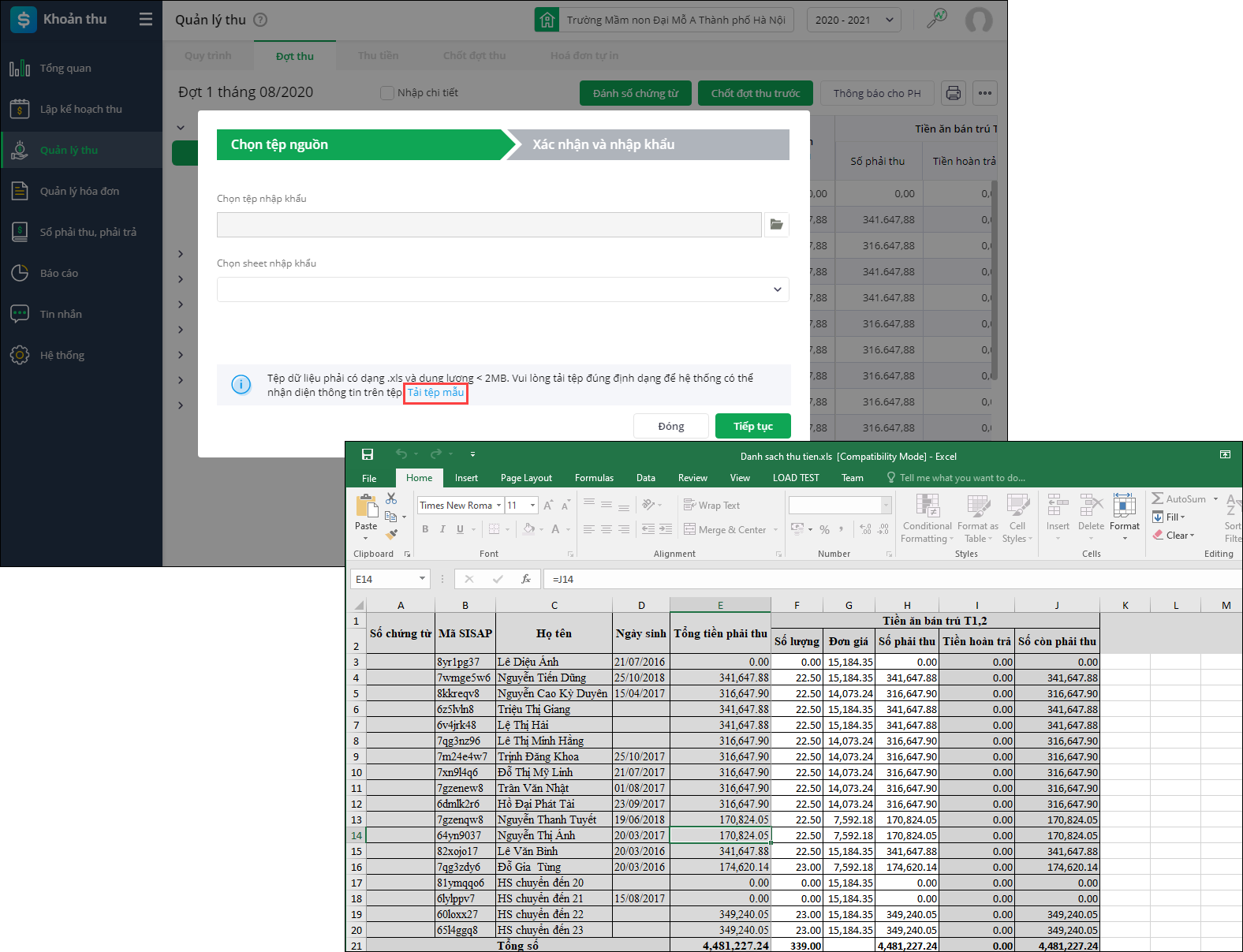 - Tải tệp mẫu excel nhập khẩu đợt thu do phần mềm cung cấp.