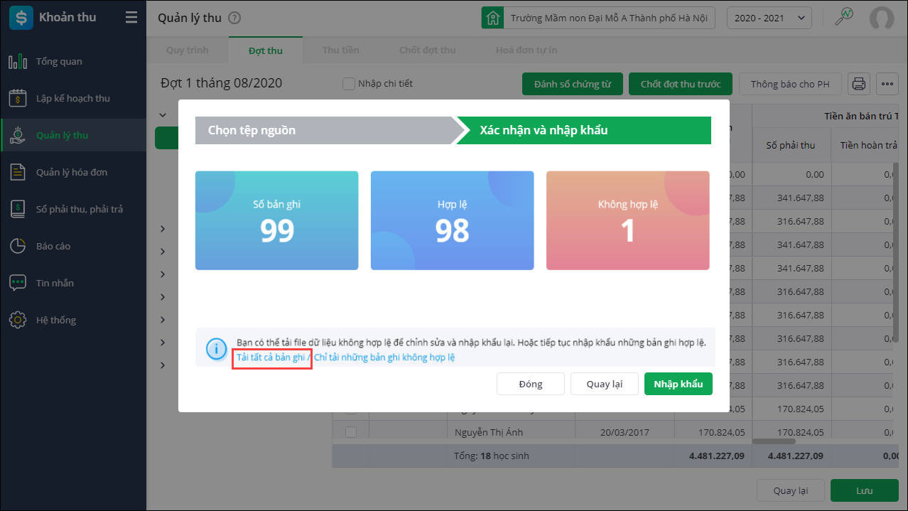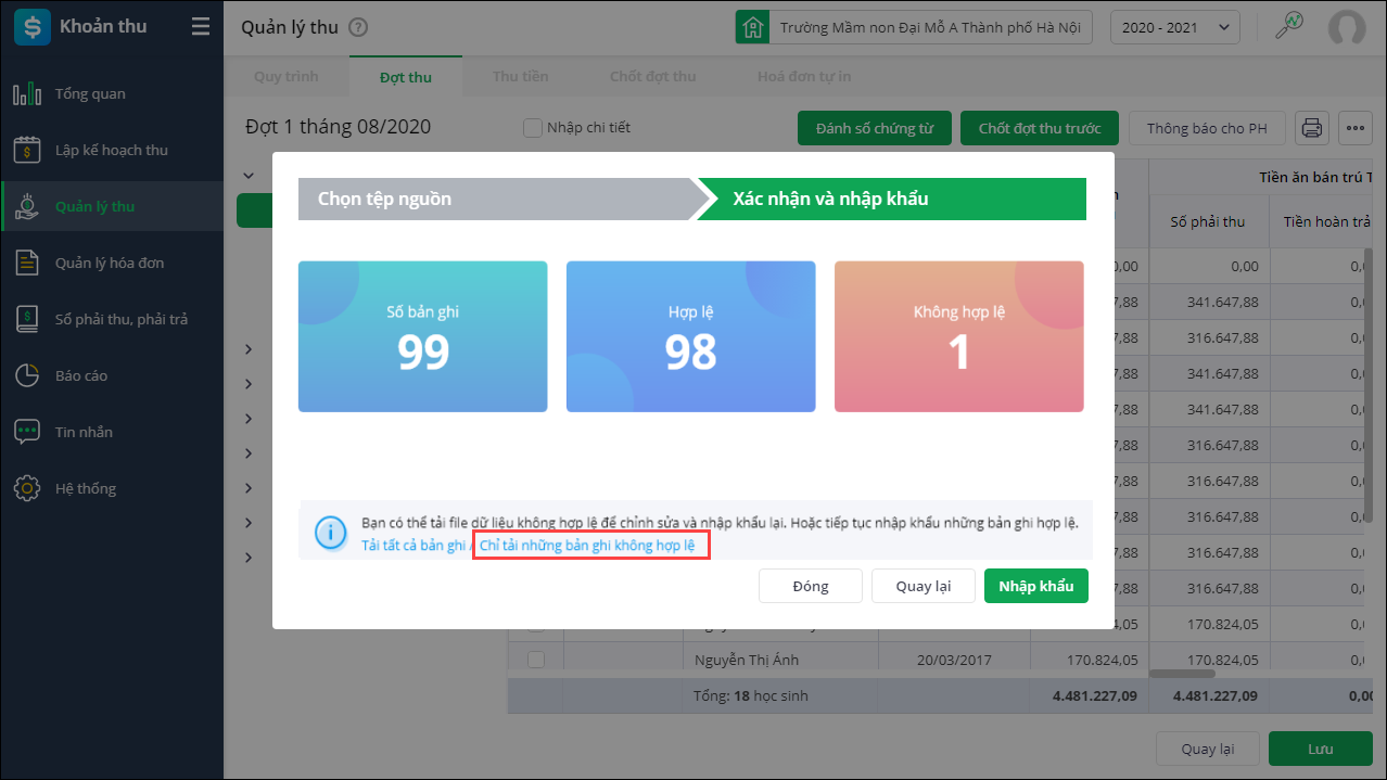 - Từ phiên bản R102: Phần mềm cho phép kế toán Chỉ tải bản ghi không hợp lệ nhanh chóng biết được những học sinh nhập khẩu đợt thu bị lỗi để tiết kiệm thời gian thao tác