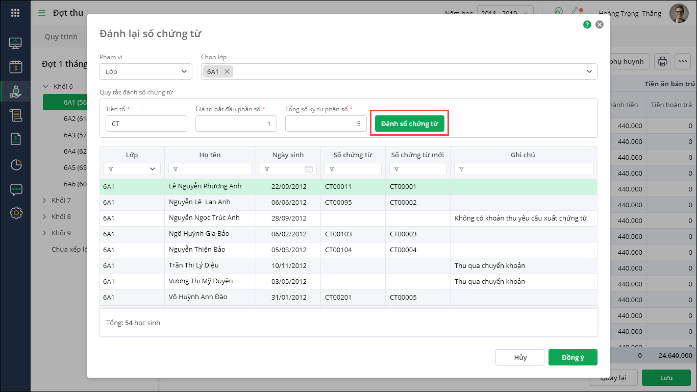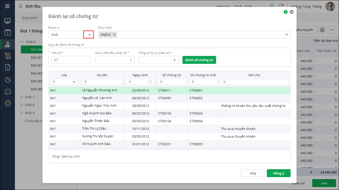- Chọn Phạm vi (Toàn trường, Khối, Lớp) cần đánh lại số chứng từ, phần mềm lấy lên danh sách học sinh theo phạm vi được chọn.