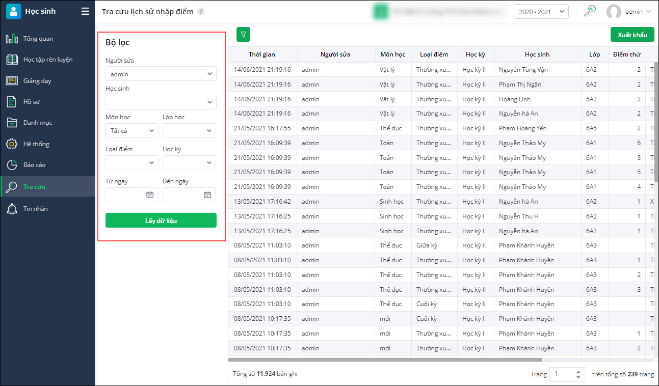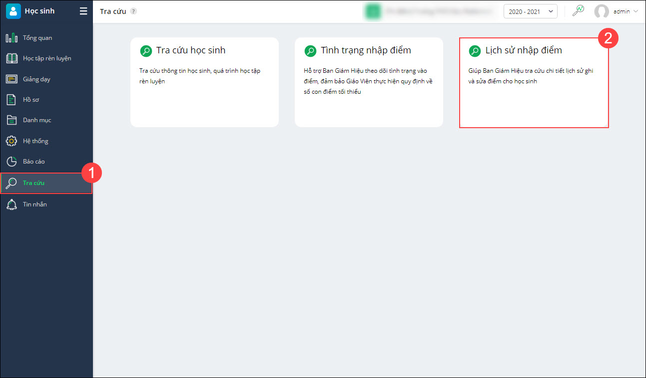 - Vào màn hình Tra cứu/Lịch sử nhập điểm