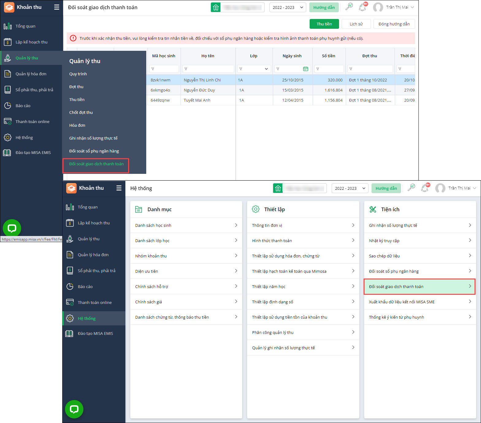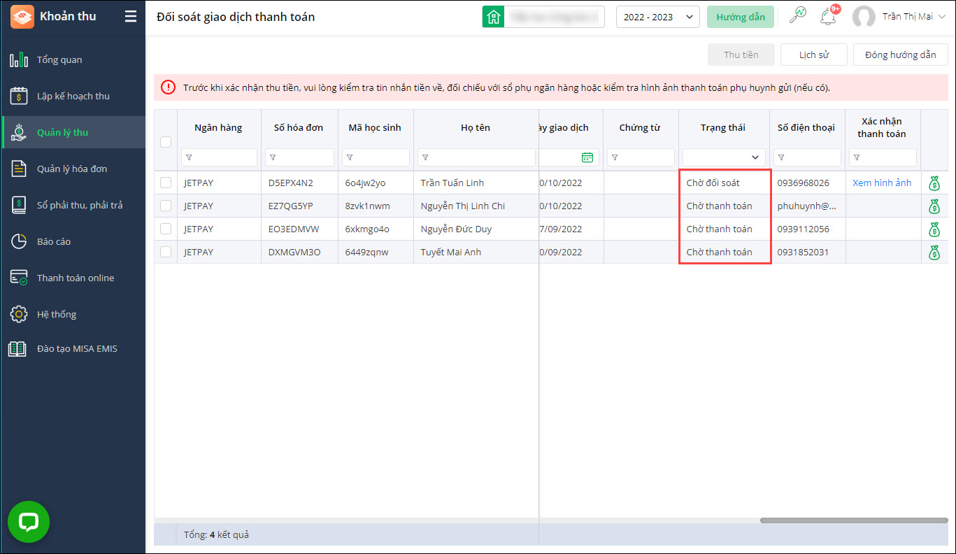 Mục đích: Vào những đợt cao điểm nhiều giao dịch thu tiền học từ phụ huynh diễn ra cùng lúc dẫn đến ngân hàng chậm trễ gửi thông báo về nhà trường. Lúc này kế toán có thể đối soát giao dịch thanh toán để nhanh chóng xác nhận thu tiền