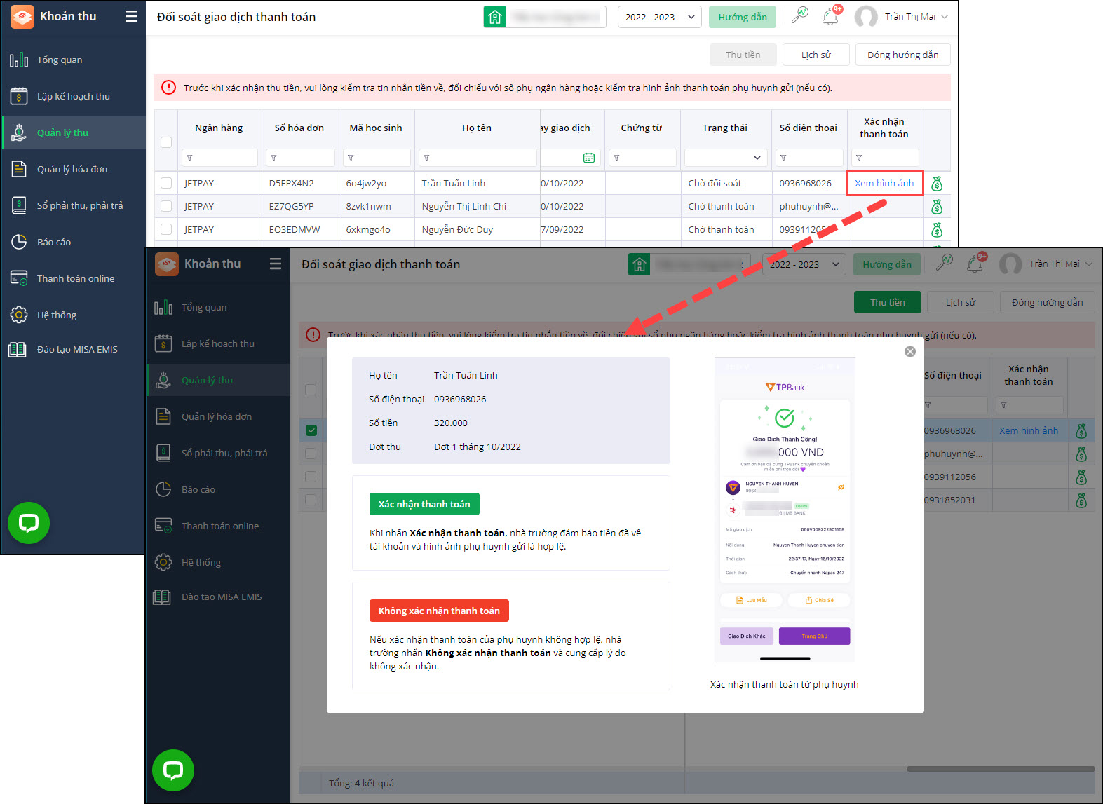 - Nếu hình ảnh giao dịch gửi từ phụ huynh hợp lệ, kế toán kiểm tra số tiền thực nhận đã về tài khoản nhà trường và chọn Xác nhận thanh toán.