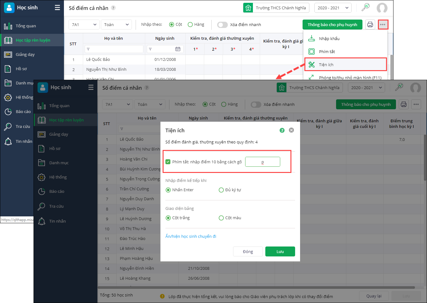 - Để có thể thiết lập nhanh các kí tự nhập điểm anh/chị nhấn Tiện ích
