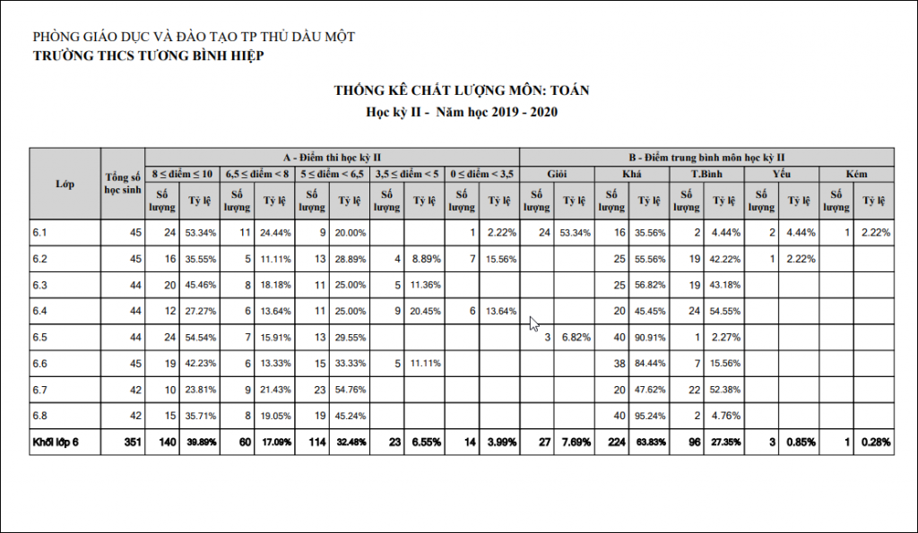 - Năm học, học kỳ, Phạm vi (Toàn trường, Khối) và Môn