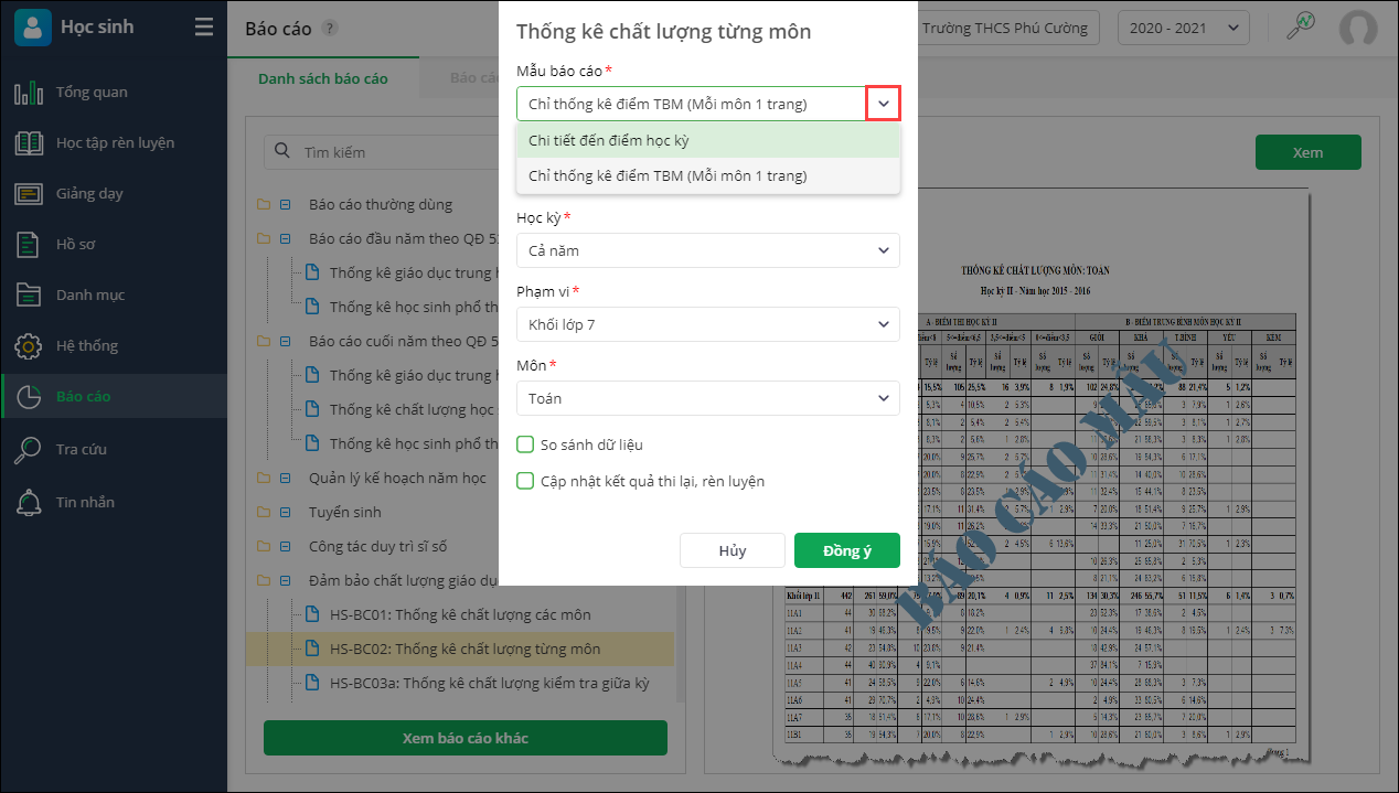 Xem hướng dẫn lập báo cáo HS-BC02 – Thống kê chất lượng từng môn tại đây.