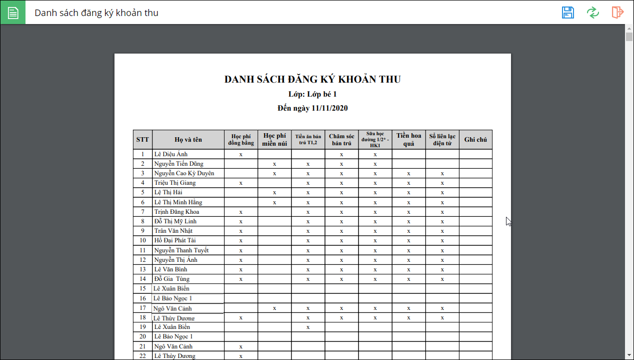 - Từ phiên bản R102: Phần mềm cho phép kế toán xem được số lượng đăng ký các khoản thu của toàn trường để báo cáo cho Ban giám hiệu hoặc đối chiếu với các bên liên quan.