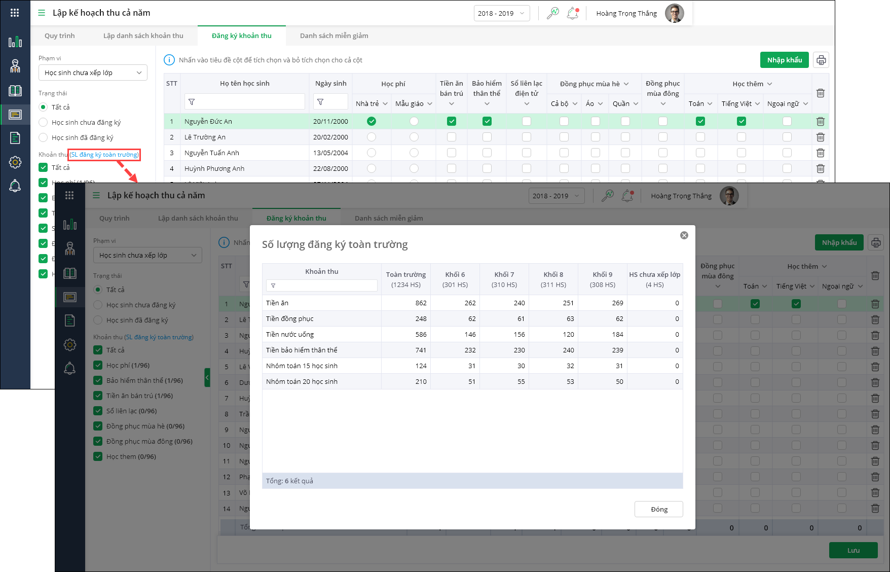 Bổ sung xem tổng số lượng đăng ký của toàn trường tại màn hình Đăng ký khoản thu
