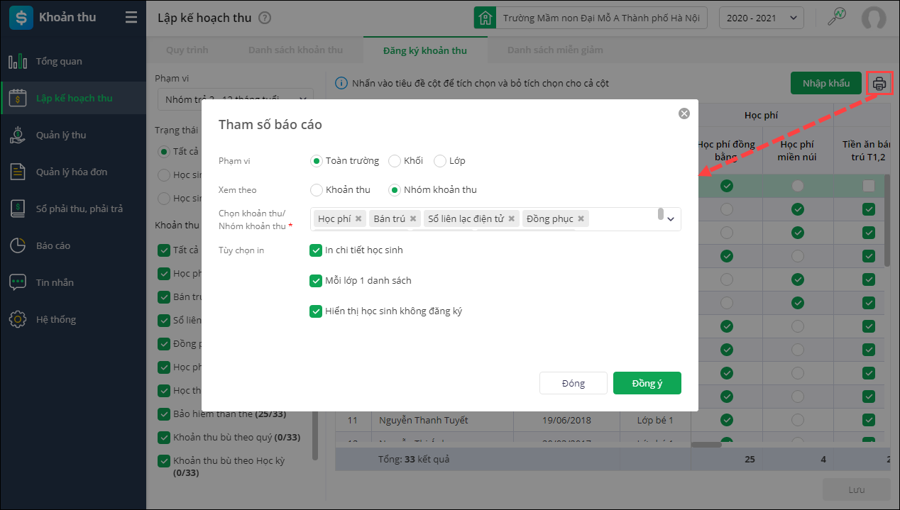 - Xem theo, chọn Nhóm khoản thu, khoản thu cần in