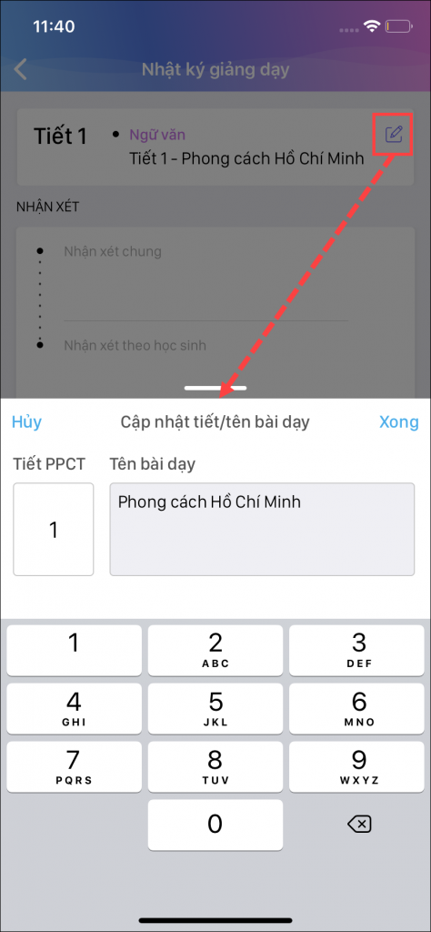 tại tiết học tương ứng và thực hiện chỉnh sửa Tiết theo phân phối chương trình cũng như Tên bài dạy trong ngày.
