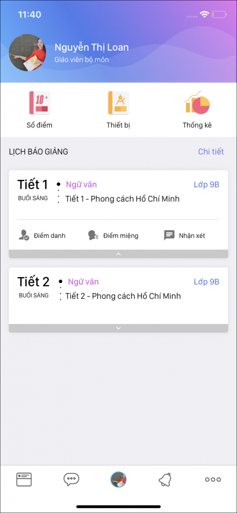 - Chạm vào tiết báo giảng cần xem chi tiết, tại đây anh/chị theo dõi thông tin về Điểm danh, Điểm miệng và Nhận xét của tiết học đó.