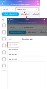 - Chọn học kỳ và nhấn vào bộ lọc ,ứng dụng tự động lấy lên danh sách các lớp anh/chị đang được phân công giảng dạy. Chọn lớp cần nhập điểm