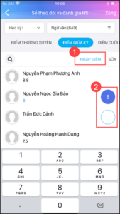 - Để nhập điểm cho cả lớp, anh/chị chọn Nhập điểm, ứng dụng tự động xuống dòng sau khi nhập điểm cho học sinh. Nhấn Xong để lưu điểm vừa nhập cho học sinh.