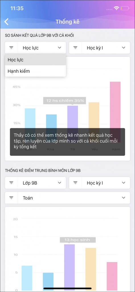 Giúp giáo viên bộ môn, giáo viên chủ nhiệm hay hiệu trưởng có thể theo dõi thống kê tình hình các môn học của các lớp trong trường. Với từng vai trò khác nhau thì anh/chị có thể theo dõi tình hình thống kê khác nhau.
