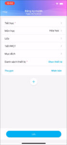 - Nhập các thông tin còn thiếu trên phiếu mượn: Tiết học, Lớp, Tiết PPCT,… Nhấn Lưu để lưu thông tin phiếu mượn.
