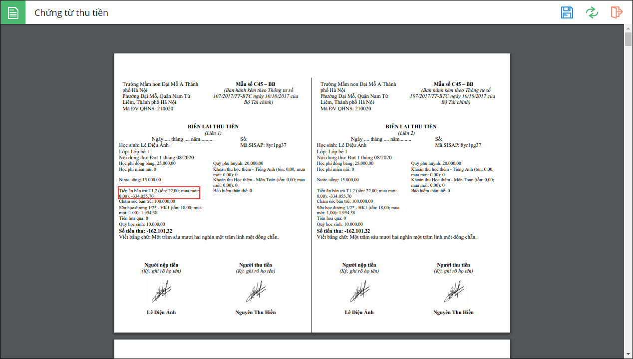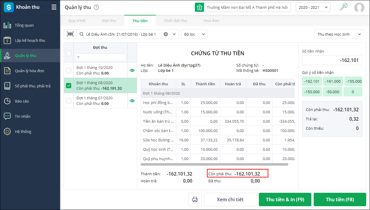 - Từ phiên bản R102: Phần mềm cho phép ghi số âm số phải thu giúp kế toán dễ dàng hoàn trả tiền cho học sinh nếu số tiền hoàn trả tháng trước cao hơn số tiền phải thu tháng này