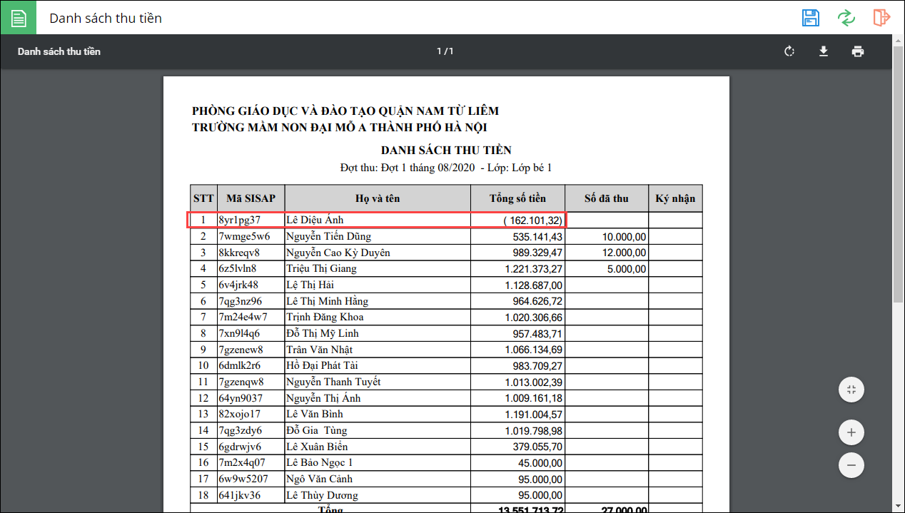 - Trên danh sách thu tiền