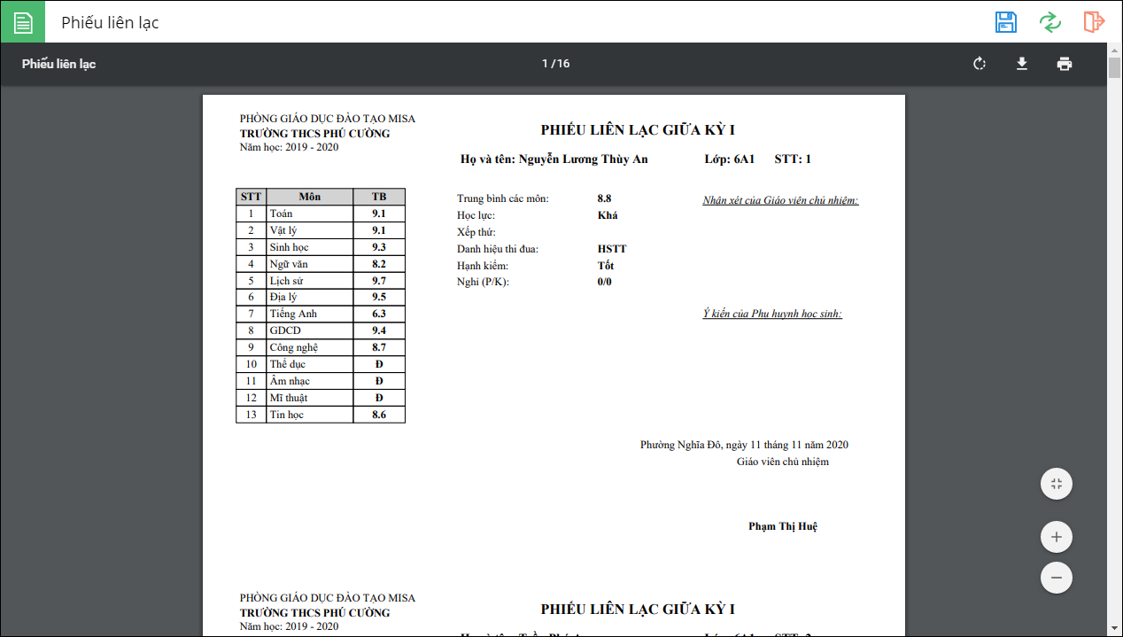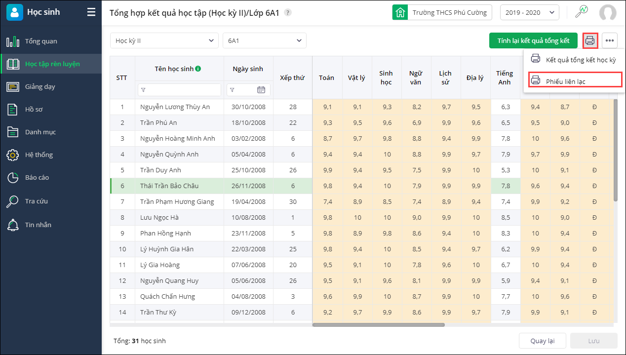 Ngoài ra anh/chị thực hiện in phiếu liên lạc để gửi cho phụ huynh trên màn hình Báo cáo, xem hướng dẫn tại đây.