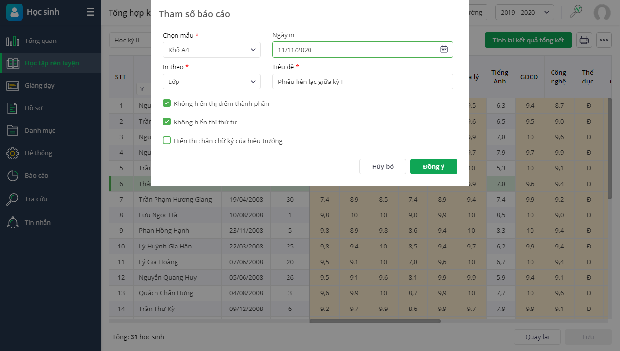 Ngoài ra anh/chị thực hiện in phiếu liên lạc để gửi cho phụ huynh trên màn hình Báo cáo, xem hướng dẫn tại đây.