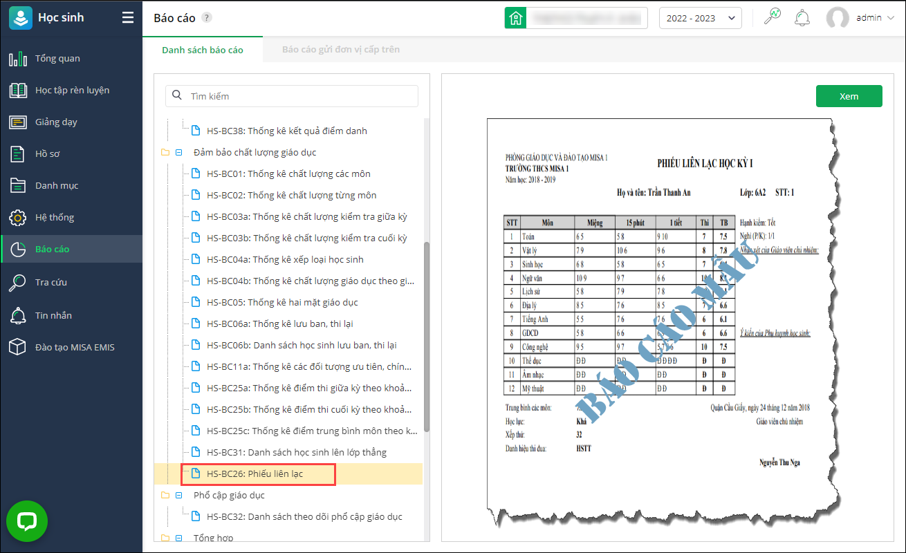 - Vào Báo cáo\Danh sách báo cáo\Đảm bảo chất lượng giáo dục. Chọn HS-BC26: Phiếu liên lạc.
