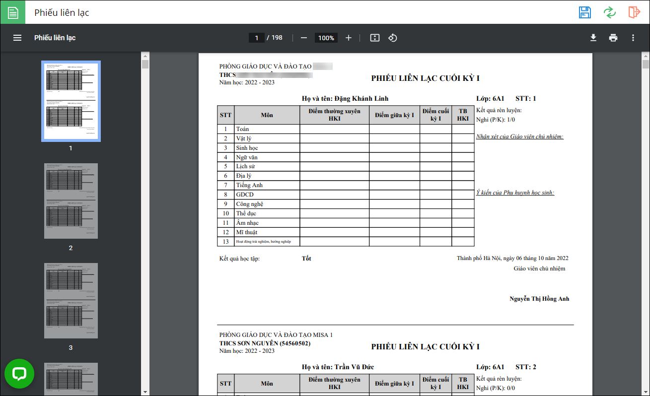 - Nhấn Đồng ý. Phần mềm trả ra phiếu liên lạc theo thiết lập bên trên. Anh/chị có thể chọn tải file dưới nhiều định dạng (PDF, Excel, Word).